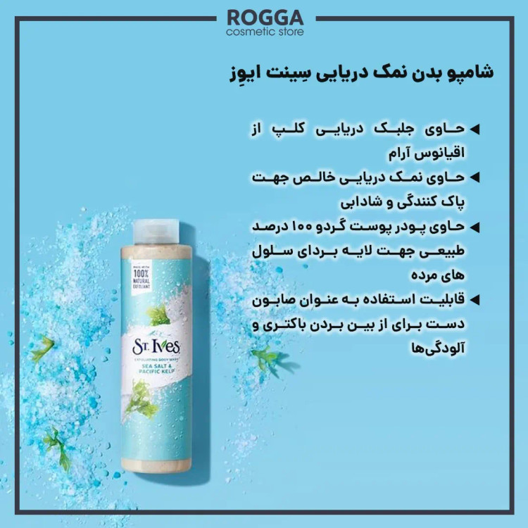 شامپو بدن اسکرابی نمک و جلبک دریایی سینت ایوز St.Ives دارای نمک دریا و جلبک کلپ از اقیانوس آرام است که موجب شادابی پوست میشود و آن را شفاف و صاف می کند. شامپو بدن ساحلی جلبک و نمک دریای سنت ایوز با الهام از اقیانوس ها و دریا حواس شما را بسمت صدف های دریایی و بوی خوش ساحل میبرد.شامپو سینت ایوز فاقد پارابن است و برای انواع پوست مناسب میباشد.شامپو بدن Sea Salt & Pacific Kelp سینت ایوز منبع غنی از آنتی اکسیدان ها و ویتامین های ضروری پوست میباشد ک موجب لایه برداری و تقویت بافت پوستی شما میشود. از ترکیبات دیگر این شوینده فوق العاده گردو و گلیسیرین است ک موجب تغذیه پوست و رطوبت رسانی به لایه های پوستی میشود. این شوینده حاوی پپتید های سازنده پروتئین ، کراتین و کلاژن برای پوست است . این شامپو کاملا وگان میباشد و فاقد تست روی حیوانات است.